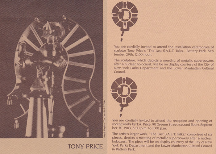 Tony Price : Atomic Art exhibitions in New York City in 1983 and '84 included exhibitions in SoHo spaces provided by Ann Maytag at the corner of Spring and Greene, and Ed Nakhamkin at the corner of Broadway and Houston. In addition, a major public installation of Price's iconic work The Last S.A.L.T. Talks was presented in Battery Park in lower Manhattan, and a screening of the film Atomic Artist, by Glenn Silber and Claudia Vianello, was presented at a benefit for the Film Fund at Greene Street Cafe. |