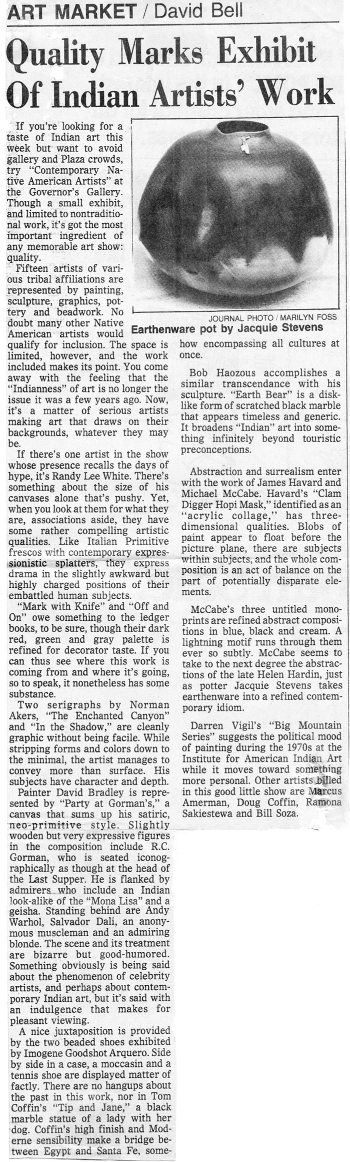 Contemporary Native American Artists, was on display in the Governor’s Gallery (and on the Capitol Grounds), and featured the work of artists Marcus Amerman, Norman Akers, David Bradley, Doug Coffin, Tom Coffin, Imogene Goodshot Arquero, Patrick Gomez, James Havard, Bob Haozous, Michael McCabe, Ramona Sakiestewa, Bill Soza, Darren Vigil, Jacquie Stevens, and Randy Lee White.