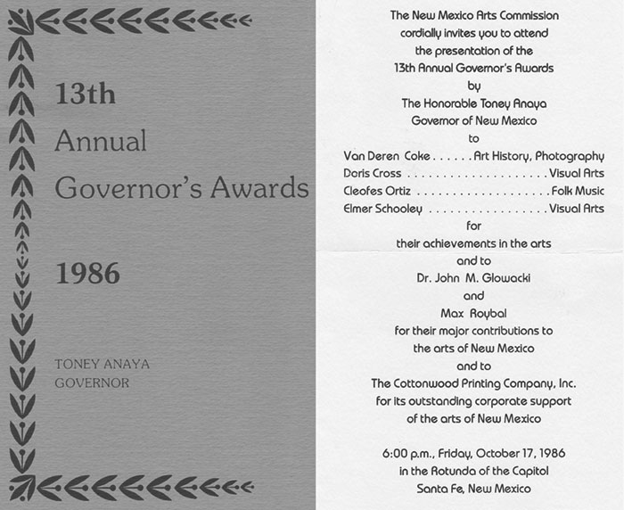 The 1986 Governor's Awards for Excellence & Achievement in the Arts were awarded to Van Deren Coke, Doris Cross, Cleofes Ortiz, Elmer Schooley, Dr. John Glowaki, Max Roybal, and Cottonwood Printing Co. Recipients were chosen by the New Mexico Arts Commission.