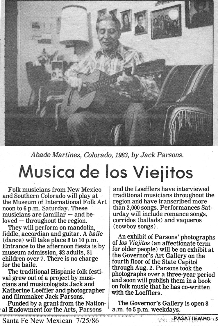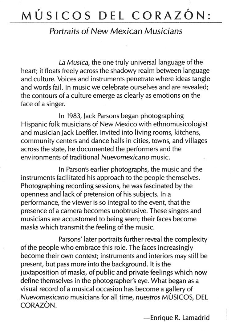 Los Músicos del Corazón: Portraits of Traditional Hispanic Musicians by Jack Parsons Governor's Gallery July 7, - August 2, 1986 James Rutherford - Curaror, Gallery Director