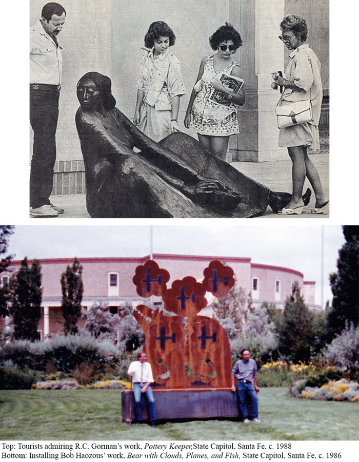 Until that time there was no precedent for the display of outdoor sculpture at the Capitol save for a couple of traditional bronzes of historical political figures. I approached the Legislative Council Service (the landlord of the Capitol) whose longtime Director, Clay Buchannan, had been acquainted with my work and family connections, and thus was perhaps more inclined to give me the go-ahead to place the work. This installation was exhilarating for me as it was a bit subversive and marked the de-facto beginning of a sculpture garden on the Capitol grounds. It represented the kind of out-of-the-box projects that would define my tenure at the Governor’s Gallery and would be followed in coming years with numerous temporary and permanent displays of monumental works by such notable sculptors as Luis Jimenez, Allan Houser, David Anderson, Edwin Rivera, Doug Coffin, Michael Naranjo, Doug Hyde, Estella Loretto, R.C. Gorman, Dan Namingha, Glenna Goodacre, and others.