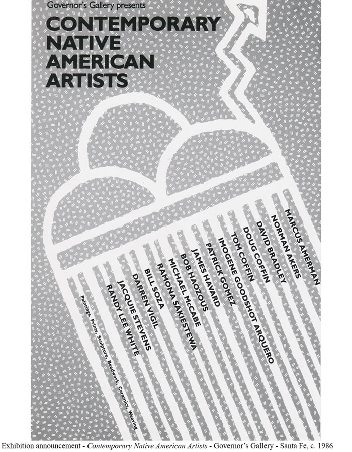 The 1986 Awards were my first and included New Mexico art luminaries such as Van Deren Coke, Doris Cross, Elmer Schooley, Cleofes Ortiz, and Max Roybal (click for details >>). My job would be to obtain artworks and materials to display in an exhibition at the Governor’s Gallery, assist with publicity, and coordinate the participation of the Governor and First Lady in the awards ceremony and gallery reception. The stature of those being recognized meant the Awards were always a highpoint for the Governor’s Gallery that encapsulated a truly statewide recognition of the arts. During my tenure, I had the honor of organizing exhibitions for an impressive list of recipients including many other notables such as Larry Bell, Tony Hillerman, Pop Chalee, Garo Antresian, and others. |