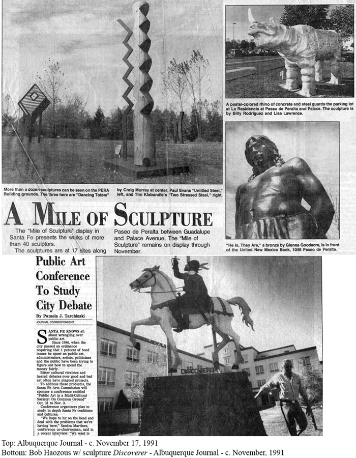 From the public, heads have been turning, cars slowing slightly, walkers stopping, staring, touching, talking to each other about the creations…“It’s a lot of fun putting big art outside in public places” Rutherford says. “The audience increases exponentially, and it seems to affect the public in mostly positive ways. It’s something that will cause people to realize Santa Fe is a vibrant art community.” (Fauntleroy, 1991 - click here to view article >>)
