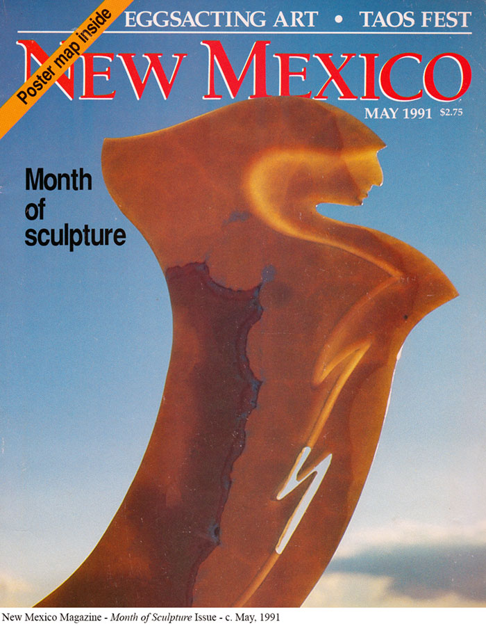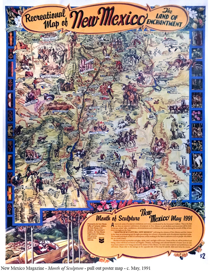 I ran with the idea and set about contacting public and private venues around the state inviting them to participate in Month of Sculpture. In the end, 62 venues in 20 cities were listed on the reprint of the map – many of whom developed exhibits and programming specifically in response to my call. New Mexico Magazine ran a cover story and included the re-purposed vintage poster/map as a tear out (click here to view article >>).