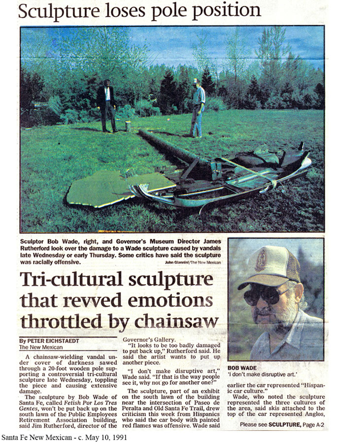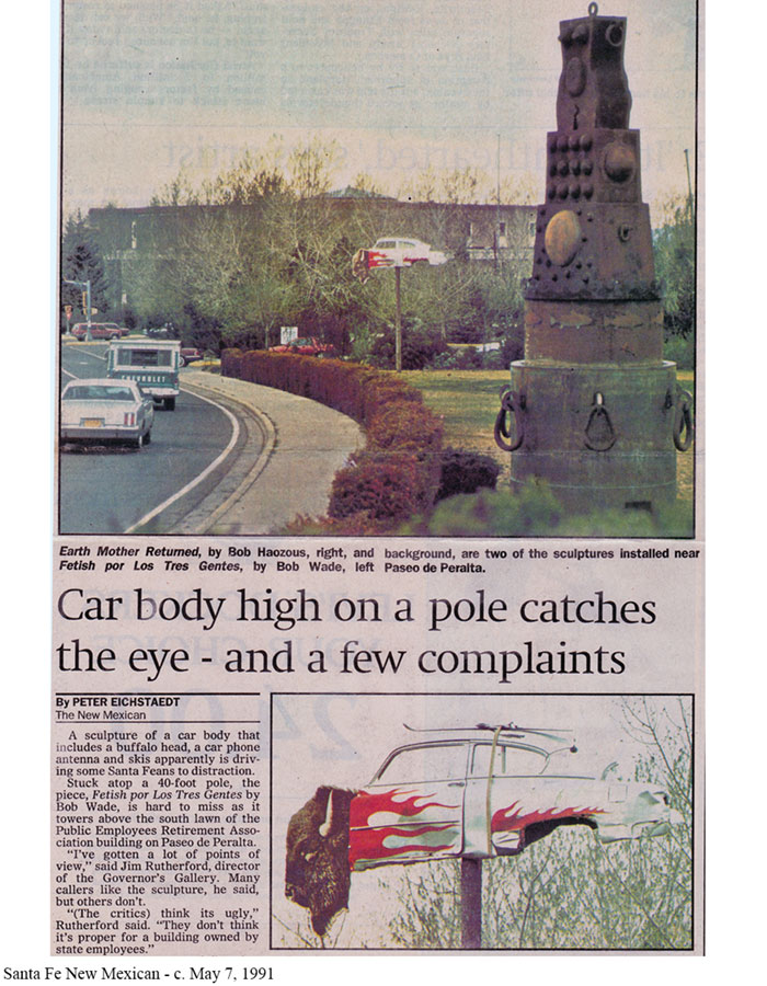 These two projects combined fulfilled important goals by engaging the public and the media around public art and elevating the state’s stature as an art center. In addition to the significant statewide participation and extensive press coverage, the projects inspired a dialogue at related events such as a sculpture symposium sponsored by the Stables Art Center in Taos and a public art conference entitled "Public Art in a Multi-Cultural Society: On Common Ground” sponsored by the Santa Fe Arts Commission and partially funded by the NEA. These conversations were made more salient by a controversy surrounding a work by artist Bob Wade that I had included in a display at the P.E.R.A. building across from the Capitol. The work, entitled Fetish por Los Tres Gentes, was a fabrication perched atop a 40-foot pole that was built around the side panel of a 1950s Chevy with flames painted on the side, a ski rack with skis, a cell phone antenna on the top, and an image of a buffalo head on the front. Wade described the content as tongue-in-cheek, satirical references to common cultural stereotypes – with the buffalo referencing Native American culture, the skis and cell phone antenna referencing Anglo culture, and the car body referencing the Hispanic car culture of Northern New Mexico.