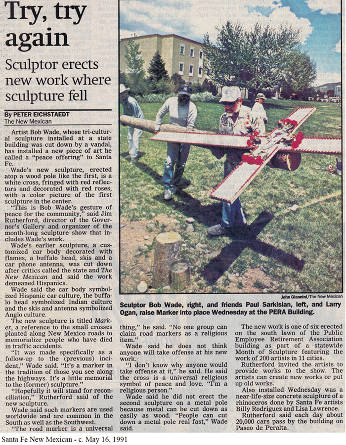The epilogue to this story came a few days later when Wade came up with a classic response to the controversy by creating a work to be installed in place of the vandalized piece. A subsequent story by Eichstaedt featured a photo of Wade, assisted by artists Paul Sarkisian and Larry Ogan, installing a wooden cross complete with a photo of the sculpture surrounded by plastic flowers and lined with tiny shimmering metal disks – emulating the roadside markers or descansos common in the Southwest that are placed at the site of a violent, unexpected death, in memoriam. I am quoted in this article saying “This is Bob Wade’s gesture of peace for the community. Hopefully it will stand for reconciliation.” (Eichstaedt, 1991)